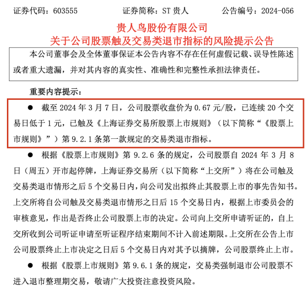 3月7日晚间,贵人鸟发布公告,截至3月7日收盘,其股价报收0.67元/股,这是自今年2月1日其股价首次跌破1元后,已经连续20个交易日收盘价低于1元,已触及相关退市规则,这也意味着贵人鸟将遗憾挥别A股市场。