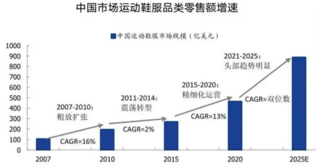当然,仅仅依靠营销来打开市场只是一方面诱因,彼时国内运动时尚消费市场欣欣向荣,增量空间敞口不断向上的外在因素,也同样是成就贵人鸟辉煌的“阻推器”。