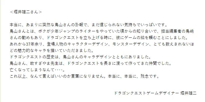游戏《勇者斗恶龙》制作人堀井雄二表示:“《勇者斗恶龙》系列的角色、怪物设计与鸟山先生分不开。”