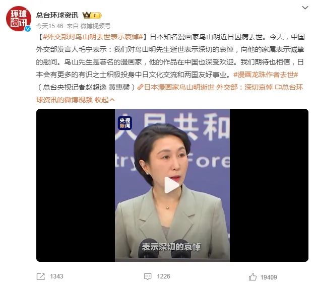 包括日本内阁官房长官林芳正,以及我国外交部发言人毛宁都在正式场合表示了对鸟山明的哀悼,毛宁发言表示:“我们对鸟山明先生逝世表示深切的哀悼,向他的家属表示诚挚的慰问。鸟山先生是著名的漫画家,他的作品在中国也深受欢迎。我们期待也相信,日本会有更多的有识之士积极投身中日文化交流和两国友好事业。”