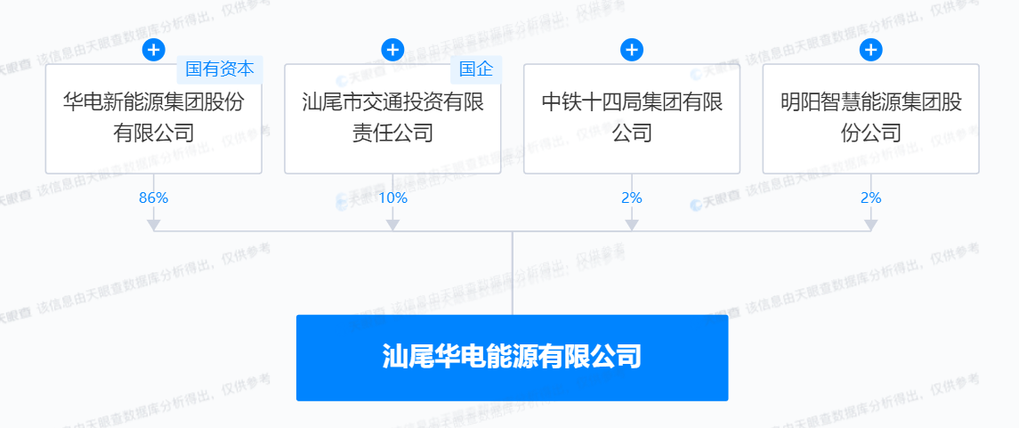 3月13日消息,天眼查显示,近日,汕尾华电能源有限公司成立,注册资本5000万元,经营范围含发电业务、输电业务、供(配)电业务,建设工程施工,海上风电相关系统研发等。股权穿透显示,该公司由华电新能源集团股份有限公司、汕尾市交通投资有限责任公司、中铁十四局集团有限公司、明阳智能共同持股。
