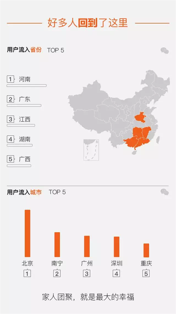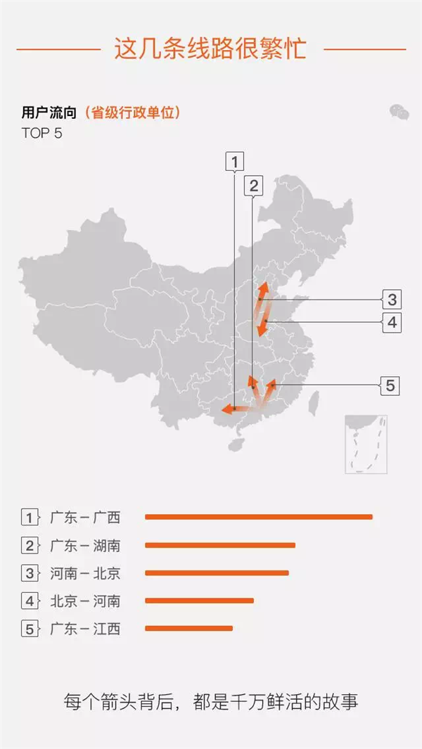 数据显示,作为外来人口的聚集地,广东、浙江、河南、江苏、山东成为春运启动以来,用户流出最多的5个省份。