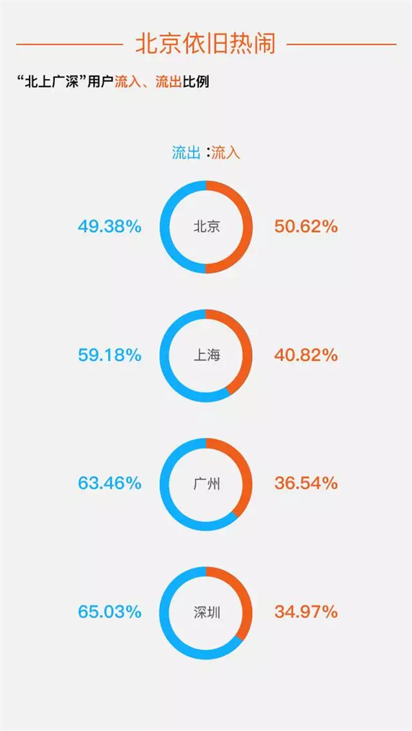 广东省是用户流出最大的省份,但其流入人口的数量同样可观。北京在流出大量人口的同时也成为人口流入量最大的城市。