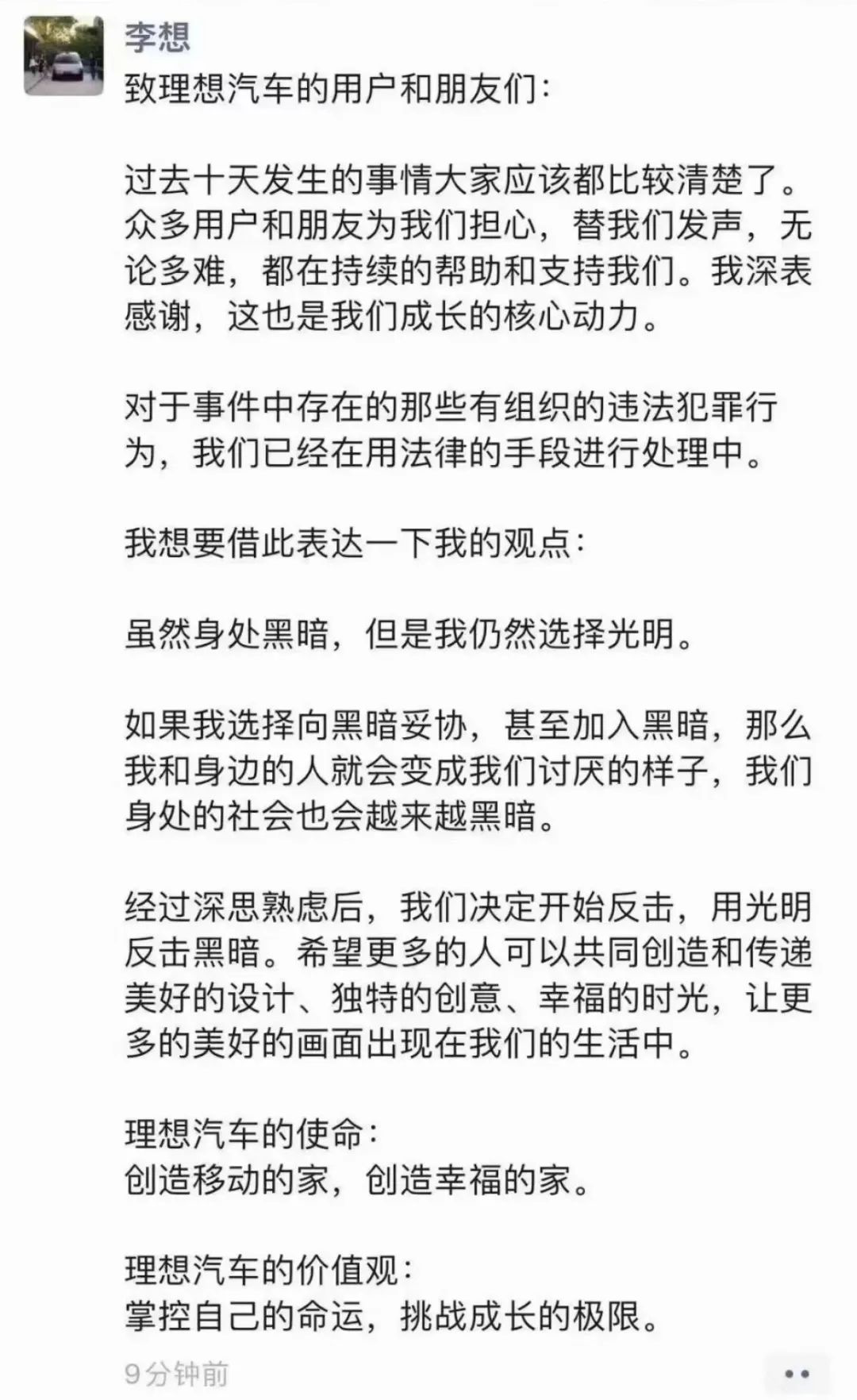 但今天看到,李想发了朋友圈,称“要反击,用光明反击黑暗”,公关圈里又在讨论。