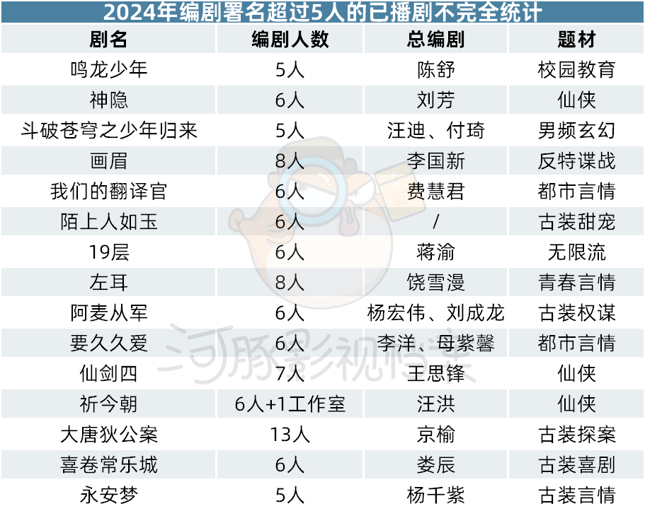 而在2024年刚刚过去的不到2个半月时间里,娱乐资本论(id:ylzbl)统计了播出的40部大小电视剧里,有15部剧的片头编剧署名都在5位以上,其中最多的一部为《大唐狄公案》,中外编剧总共7名,另外有1名剧本总监和3名责编。