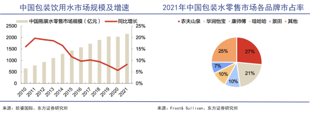 2016年开始,农夫山泉坐稳中国包装水市场第一的宝座。与此同时,农夫山泉布局的各类茶饮、果汁和功能性饮料也逐渐成功,品类创新和市场营销能力在业内都是前列水平。