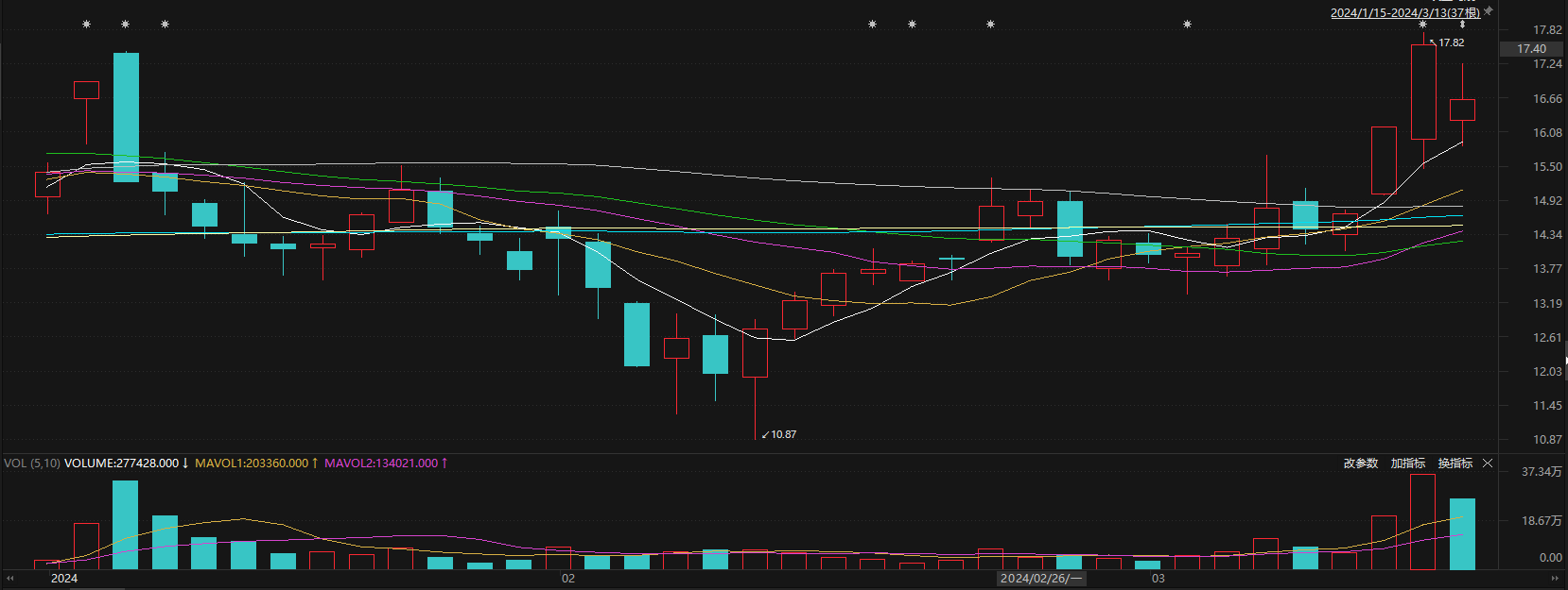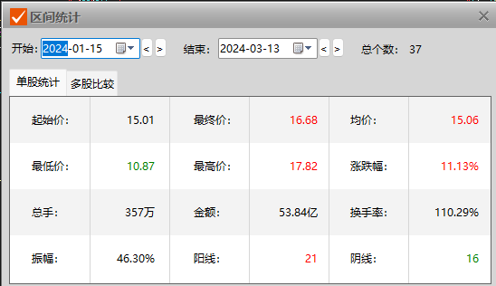 界面新闻根据东方财富Choice数据统计,2024年1月15日至3月13日,该股票股价在10.87元/股至17.82元/股之间波动,区间振幅46.3%,区间成交金额53.84亿元,区间换手率达110.29%。