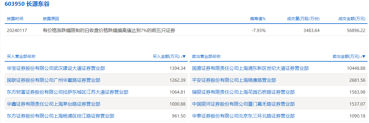1月17日,因成为“有价格涨跌幅限制的日收盘价格跌幅偏离值达到7%的前五只证券”,长源东谷龙虎榜数据显示,营业部席位合计净卖出1.17亿元。其中,知名游资炒股养家(华鑫证券上海茅台路证券营业部)为买四席位,买入1000.88万元;国盛证券上海浦东新区营业部为卖一席位,卖出1.04亿元。