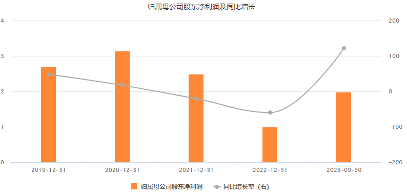 财务数据显示,2021年、2022年,公司分别实现归母净利润2.49亿元、1亿元,分别同比下滑20.71%、59.88%。2023年业绩预告显示,公司预计去年实现归母净利润为2.5亿元到2.96亿元之间,将同比增加149.86%到195.83%。
