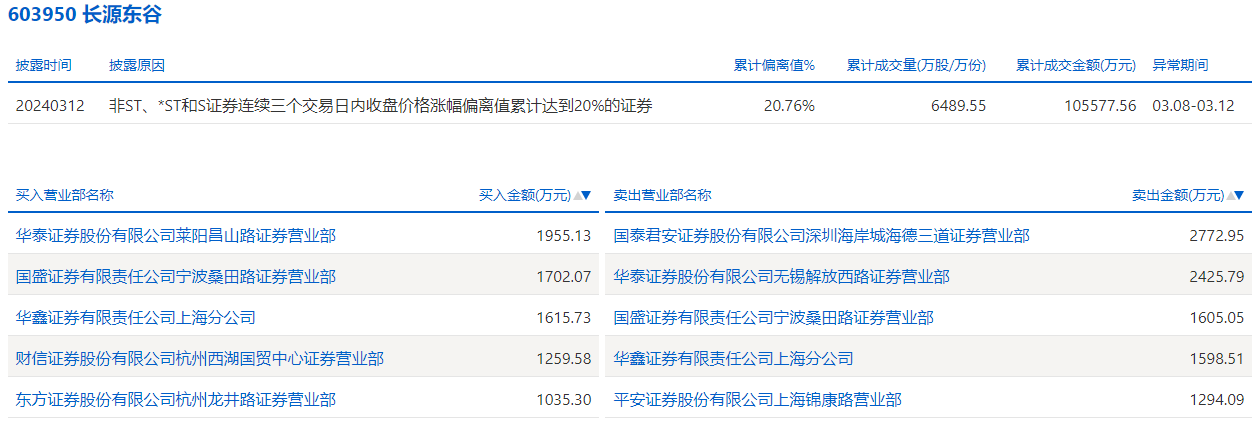 3月12日,长源东谷成为“连续三个交易日内收盘价格涨幅偏离值累计达到20%的证券”。龙虎榜数据显示,3月8日至3月12日期间,上榜营业部席位合合计净卖出2128.57万元。