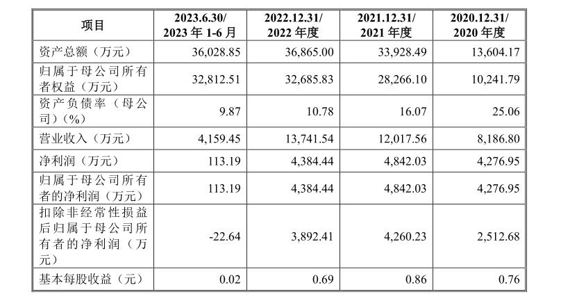 2020年至2022年,公司营业收入分别为8186.80万元、1.20亿元、1.37亿元,最近三年年均复合增长率为29.56%;归母净利润分别为4276.95万元、4842.03万元、4384.44万元。