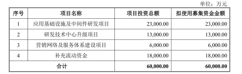 “在大数据、物联网、云计算等新一代信息技术应用不断深化的背景下,广义中间件市场增长迅速,也是公司上市后的重要着力方向。此次登陆科创板,公司募集资金计划重点投资于应用基础设施及中间件研发项目、研发技术中心升级项目、营销网络及服务体系建设项目以及补充流动资金,其中技术研发类项目占比达到约60%。“景新海表示。