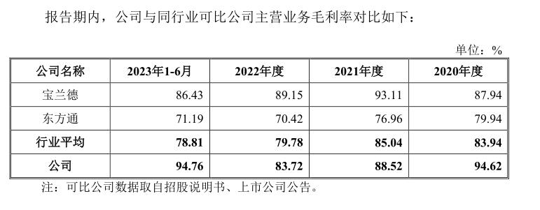 报告期内(2020年度、2021年度、2022年度及2023年1-6月),公司主营业务毛利率分别为94.62%、88.52%、83.72%及94.76%。