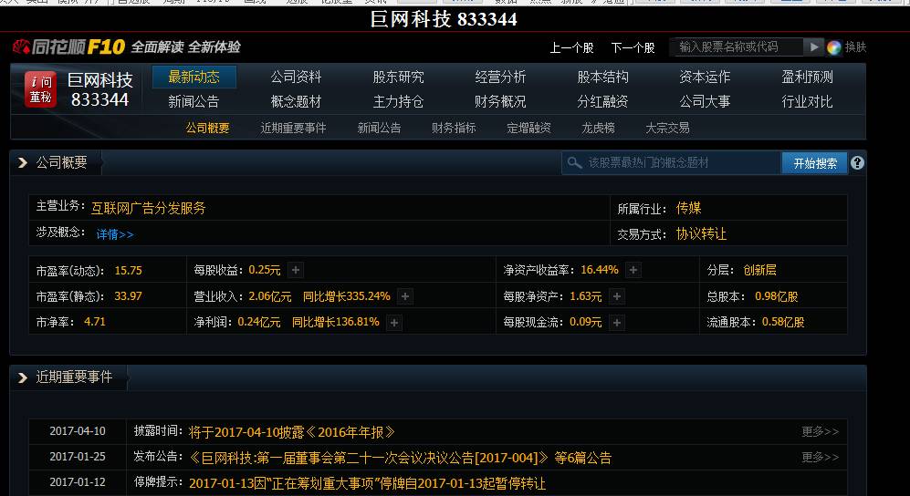 资料显示,巨网科技主要从事互联网广告的精准投放业务。2016年上半年巨网科技营业收入为2.06亿元,同比增长335%,归属于挂牌公司股东的净利润2387万元,同比增长137%。