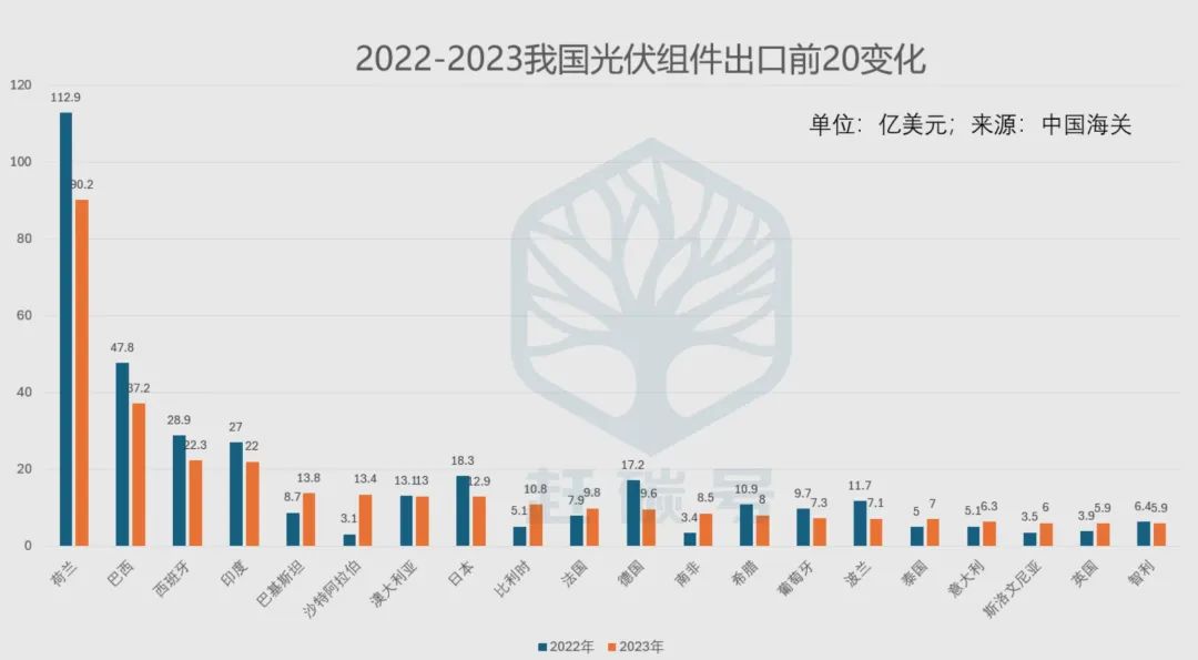 2022年4月开始,印度对从我国进口的太阳能电池征收25%的基本关税,对光伏组件则征收40%的基本关税。这导致中国对印度光伏产品出口由此锐减——印度在2022年上半年还是我国光伏产品出口的第二大市场,到了2023年上半年,已经下滑到第五名。