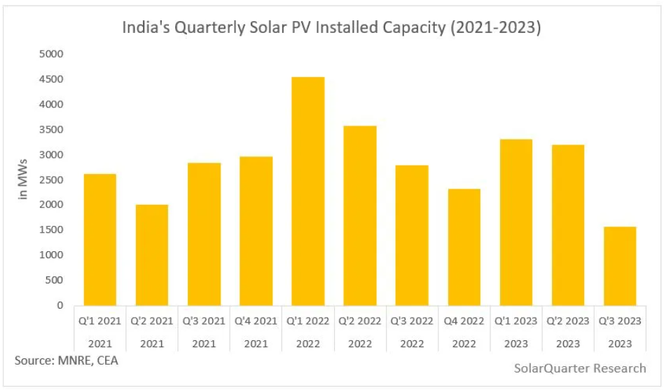 印度打压完中国光伏产品后,自己的光伏装机直线下降。印度在2023年1月至9月期间,仅实现新增光伏装机规模5.6GW,与2022年前三个季度的10.5GW相比,下降了近47%。