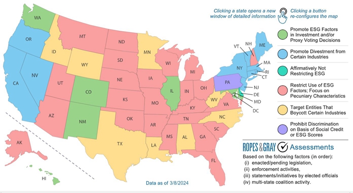 美国律所Ropes & Gray一直在追踪美国各州的ESG立法和政策情况。截至3月8日的数据,全美有超过30个州实施或提出了限制ESG的法案。