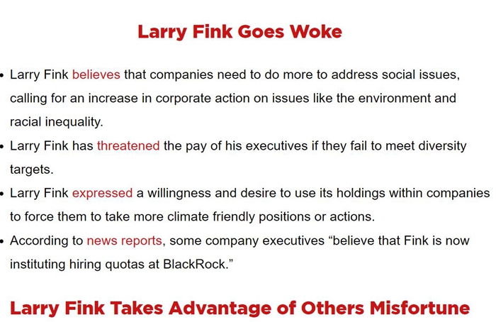 作为倡导ESG的先锋人物,黑石集团首席执行官芬克成为了重点攻击对象。Marble Freedom Trust下属机构专门制作了网页,攻击芬克是觉醒文化追随者。