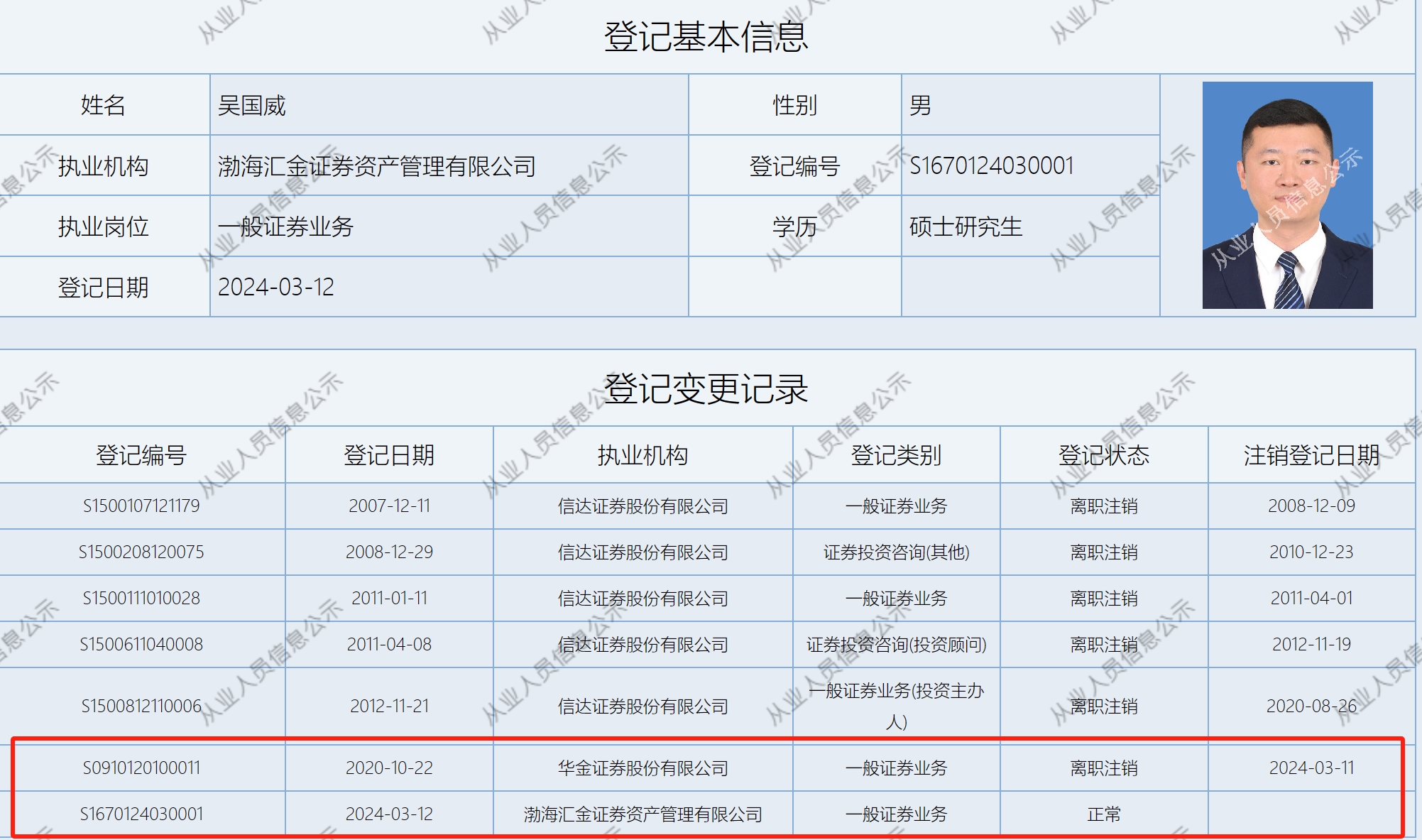 目前,渤海汇金资管公司官网董监高及分支机构负责人一栏尚未完成更新,但中国证券业协会显示,吴国威已于2024年3月11日注销华金证券登记,并火速于次日(3月12日)登记了渤海汇金资管信息。