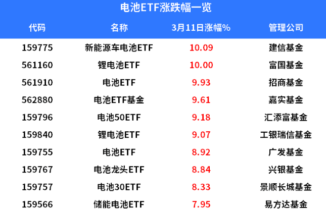 一个板块出现几家头部公司涨停很常见,但几乎整个板块都实现涨停的情况却极为罕见。这种罕见情况就发生在前几天的锂电板块。3月11日,新能源车电池ETF、锂电池ETF单日涨幅都在10%以上,市面上最主要的10支电池ETF单日涨幅都在7.9%以上。