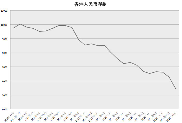 自2014年12月达到峰值后,香港离岸人民币存款规模一路下滑。香港金管局透露,截止12月底,香港人民币存款余额为5467亿元人民币,环比下降12.9%,单月降幅创纪录。