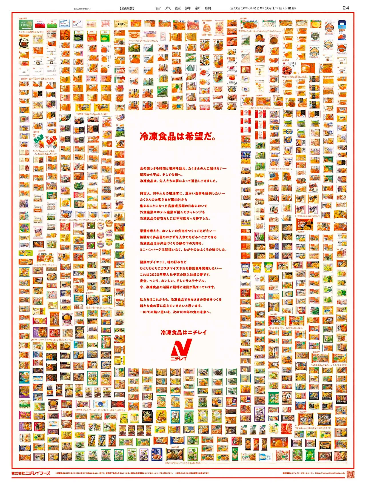 2020年,日本冷冻食品100周年,日冷成立78年。日冷在《日本经济新闻》上刊登的企业品牌广告——一张记录着日冷80年来推出的所有冷冻食品,共800多款。