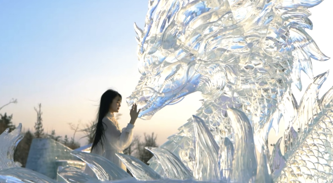 另一边,非遗传承也成为话题焦点。千万粉丝的非遗网红博主“江寻千(九月)”,与冰雕师傅及团队耗资数十万共同打造成目前单体最大的冰雕龙。视频总播放量破2亿,点赞近千万。
