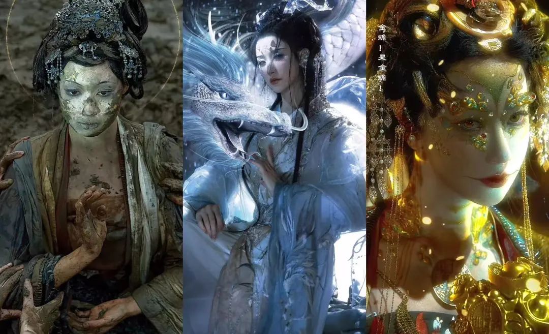 而妆造类视频,也是目前主流的玩法。短视频平台上,出现了一批主打中式美学、中式妆面的美妆汉服博主,博主“莺莺迟”还接受过央视的采访。更为升级的,则是将传统文化进行二次美学演绎,迎合了更年轻群体的口味。全网粉丝百万的艺术博主夏弃疾(下山版),将模特改造成观音、银龙、金蟾等中国古典的神仙志怪形象,吸引大批粉丝。
