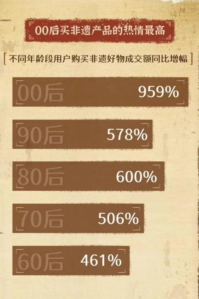 不仅爱看,“00后”还用真金白银表达自己对传统文化的热爱。根据《抖音2024非遗数据报告》显示,00后在购买非遗产品方面的增幅最高,达到了惊人的959%。