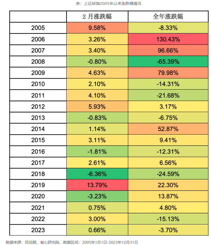 如果以2月作为春季躁动行情的代表性时间区间,以上证综指为例,自2005年以来,共有14个年度上证指数在2月是上涨的,其中有9年指数全年上涨。