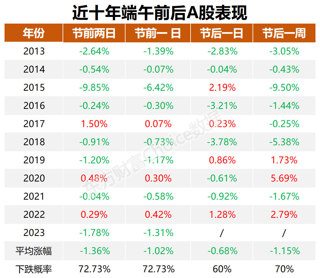 据东方财富Choice数据显示,自2013年至2023年的11年时间里,端午假期前一交易日大盘下跌概率高达72.73%,平均跌幅为-1.31%。端午节后一周下跌概率达70%,平均跌幅1.15%。节后一周出现大幅波动现象相对明显,2015年下跌9.5%,2018年下跌5.38%、2020年上涨5.69%。