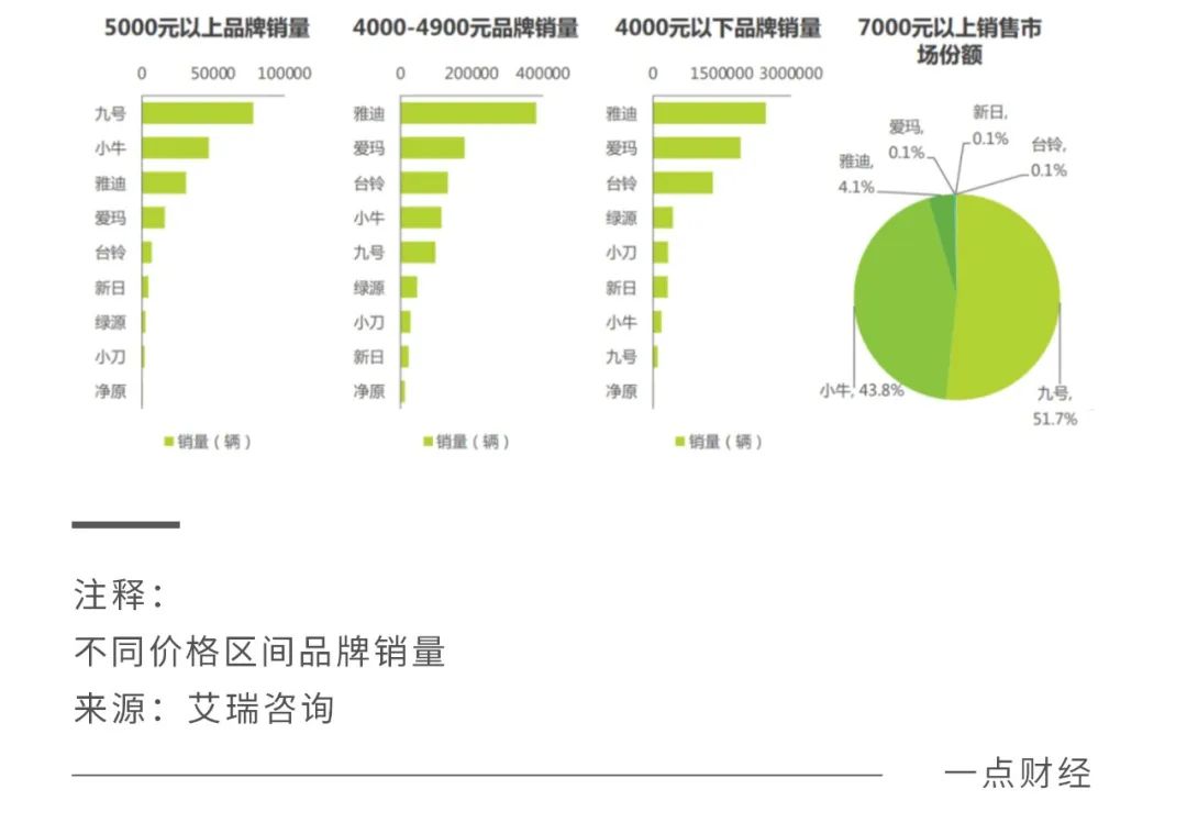 然而,雅迪和爱玛的高端化之路同样走的不顺。在7000元以上的高端市场上,二者的市场占比仅在个位数,小牛和九号公司合计超过9成的市场份额。