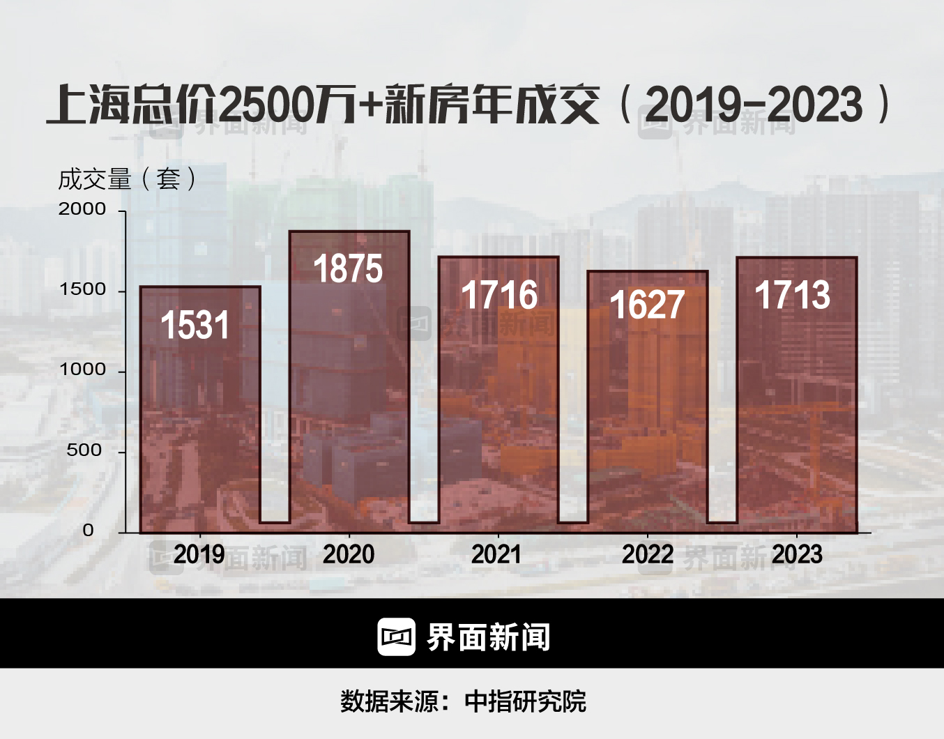 这种顾虑很有必要。去年,上海不到2000套的豪宅供应量市场也没能全部消化掉。中指研究院数据显示,2023年为上海新房顶豪的成交大年,总价2500万元以上的新房共成交1729套,平均每个月成交144套。