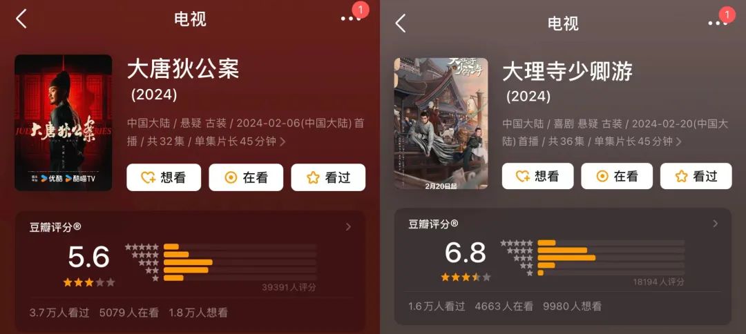 本以为有IP基础的两部剧会接棒前些年《御赐小仵作》和《唐朝诡事录》的高口碑和高热度,在古装悬疑赛道上掀起新一轮讨论热潮,可惜两部剧的播出数据和口碑均未达到预期。《大唐狄公案》在豆瓣有近4万人打出了5.6的分数,《大理寺少卿游》则有1.8万人打出了6.8的分数。