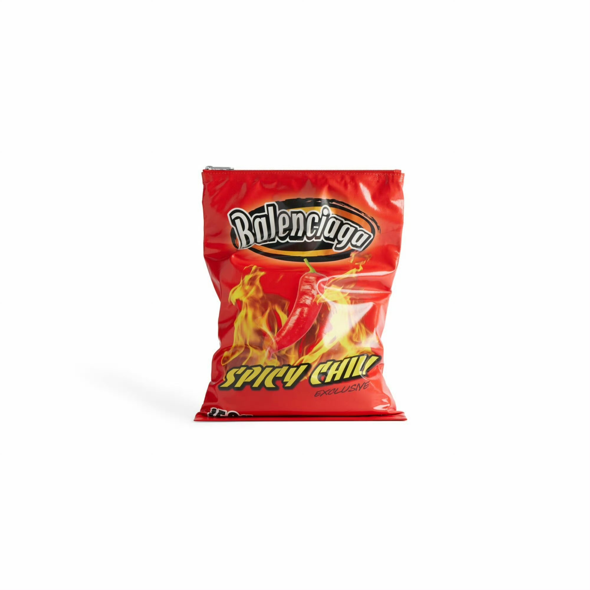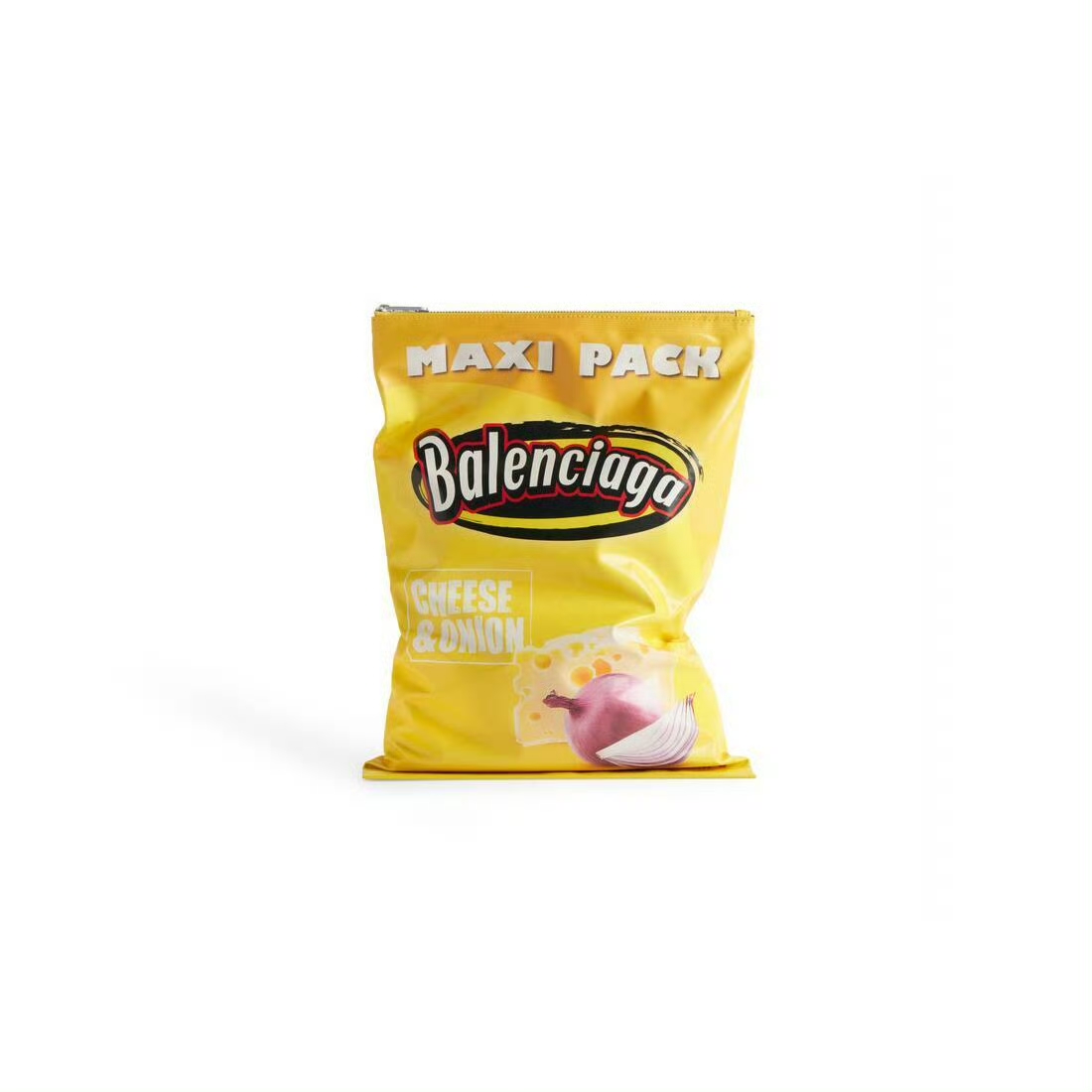 巴黎世家薯片手袋以亮片小牛皮打造而成,搭载上特地做旧的银色五金配件,除了在正面及背面压印有Balenciaga标志外,更如实还原了真实洋芋片包装的一切微小细节,连成分及条码都有标示。