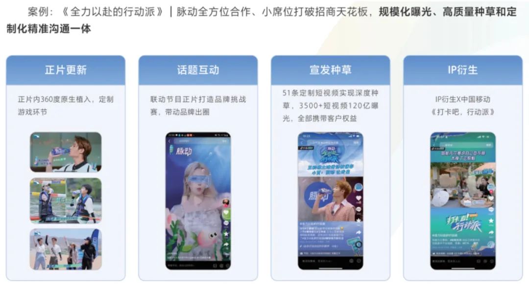 具体来说,短视频综艺的招商玩法更“花”,因为投此类综艺的品牌可借助短视频各类工具开展多种高转化的营销方案,品牌投放意愿就更强。比如《全力以赴的行动派》与脉动全方位合作,用正片、热门话题、规模化的短视频内容持续带动品牌出圈。