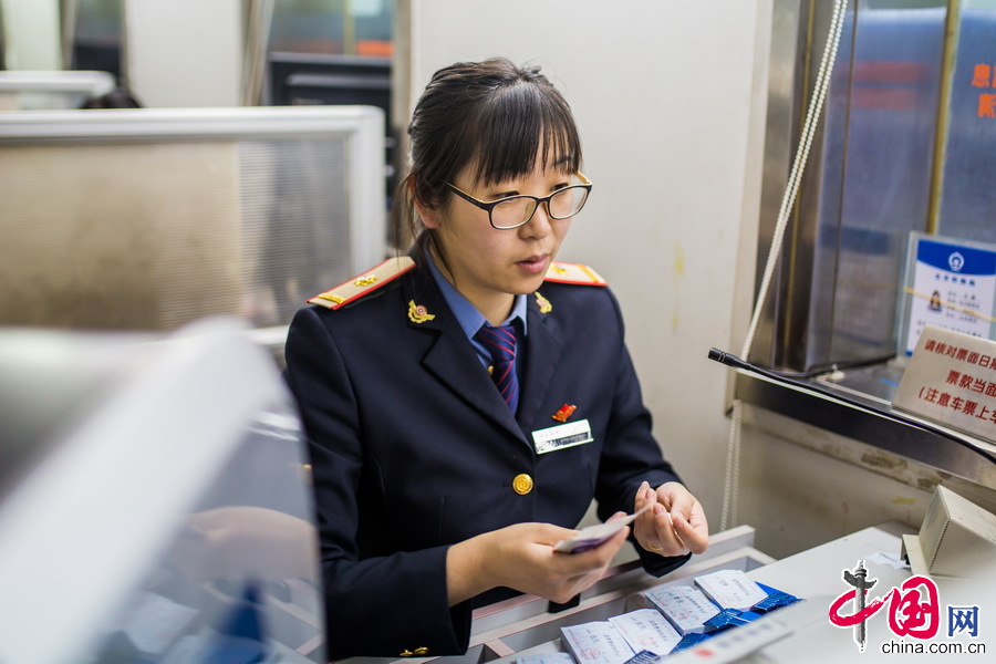 张翠霞,西站的售票员,她是已经工作了16年的铁路人,今年是她第六次在售票窗口度过除夕夜了,值得一提的是,今年她的老公也和他一样要在自己的岗位上度过除夕夜,而六岁的女儿只能和爷爷奶奶在家吃团圆饭了。中国网 郑亮摄影