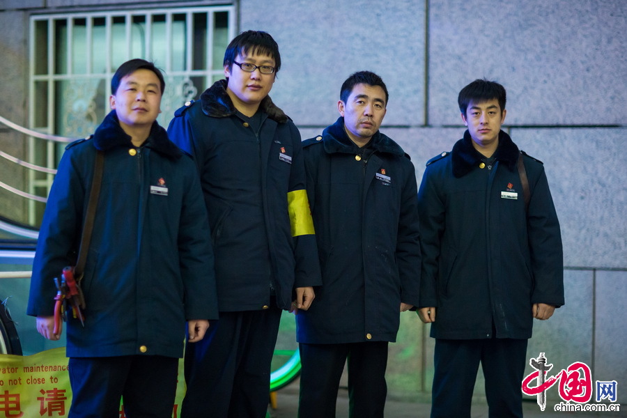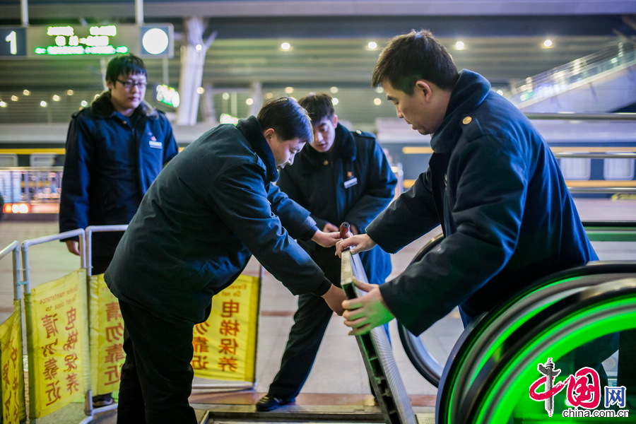 除夕夜的客人应该很少了,但是作为西客站当班的电梯维修工还是要在岗位上坚守,即使只有一个让客人乘坐电梯,他们也要保证安全。中国网 郑亮摄影