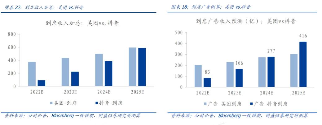 据国盛证券研报测算,交易额方面,2025年抖音到店总交易额或达到3000亿元,约为美团一半。但在收入方面,2025年,抖音到店收入或达590亿元(广告416亿元/佣金174亿元),届时将赶上美团到店酒旅业务收入。