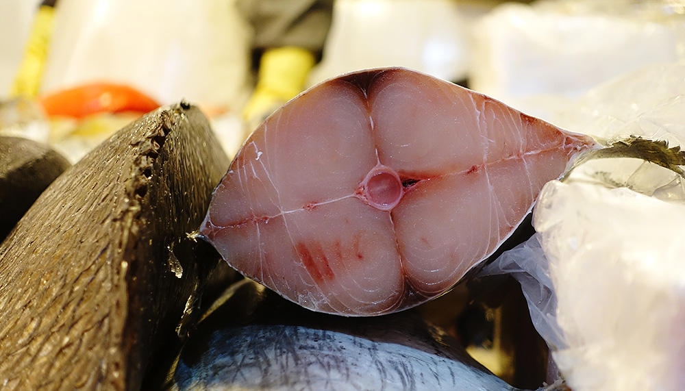 摊位前,超大的某种鱼。摆在那里,像吉祥物一般,供人膜拜。