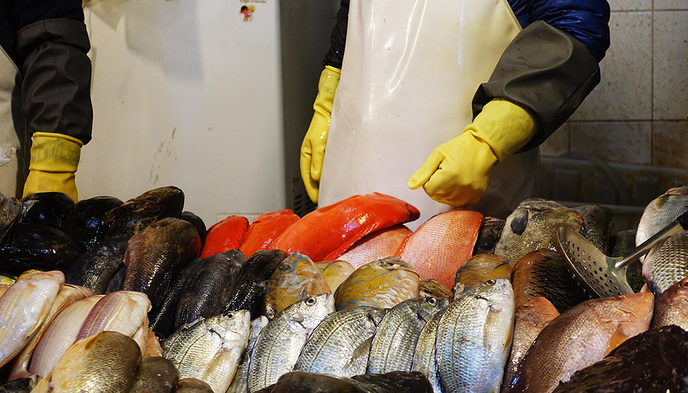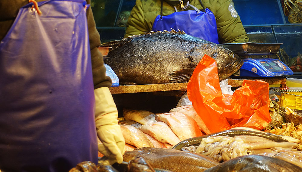 鱼摊的隔板上,贴着大小不一的财神画,十分有中国特色。老板一定是对金钱充满了渴望,否则为何贴了这么多?