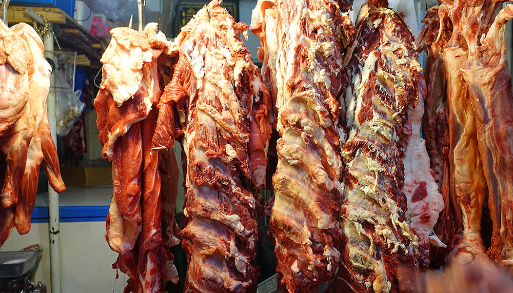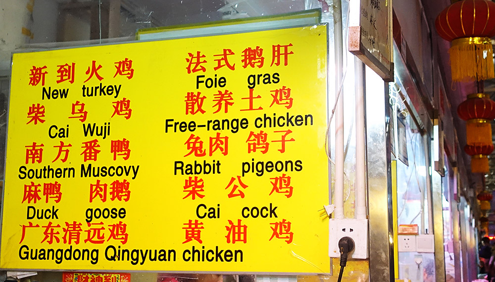 一只只张牙舞爪的鸡,被整齐的摆放在摊铺上。类似的几家店铺上,都有中英文双语的标示。