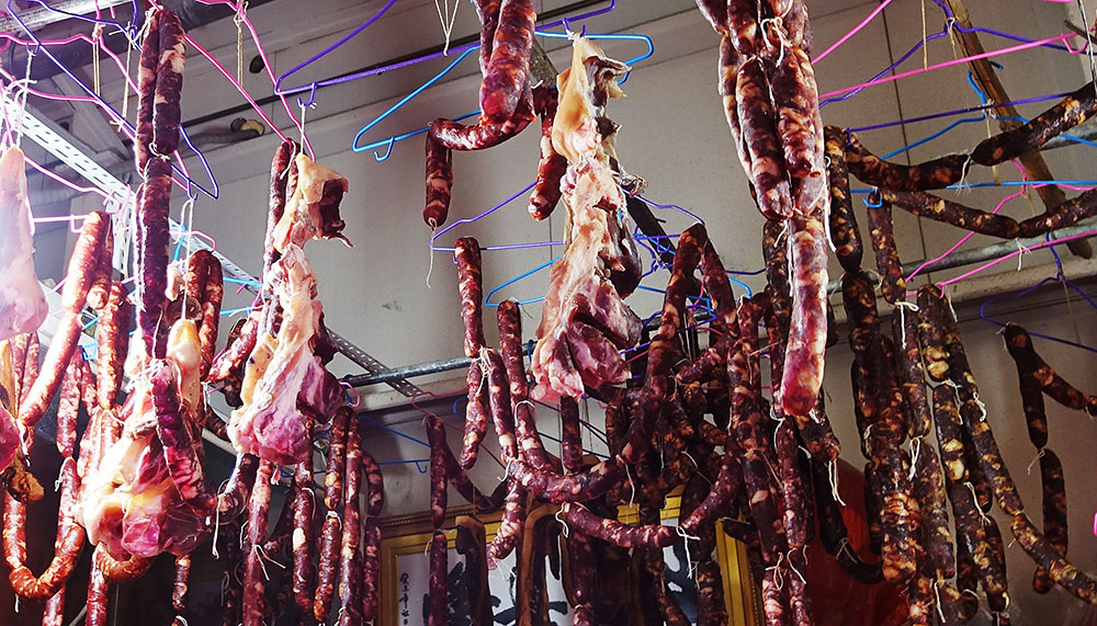 在肉铺里,顶部几乎都挂满了这样的香肠。而老板就站在这些香肠的下面。