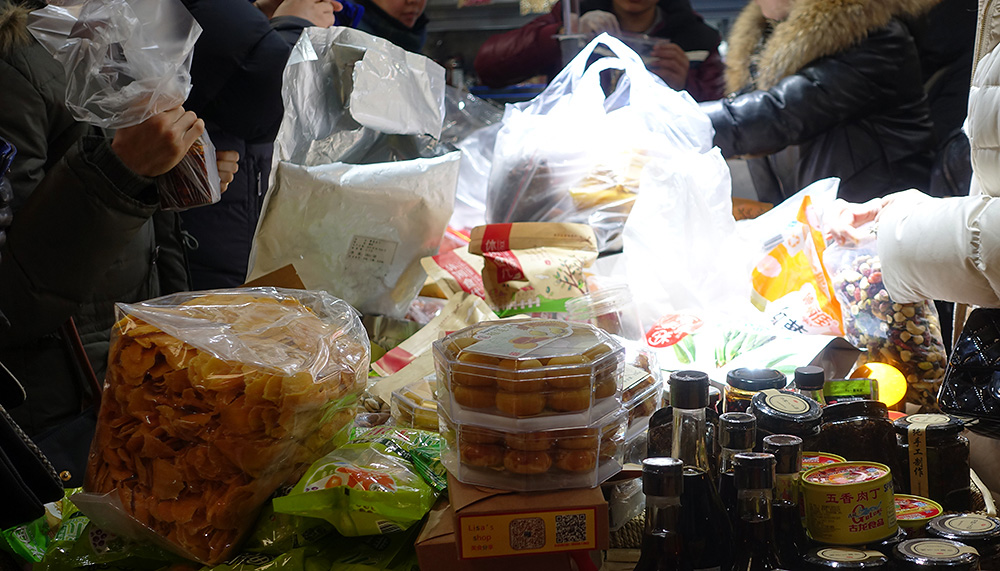干货摊前,大肆采购的人们。总是不知何时,就从身边伸出一只手。老板的眼力脑力也真是好。