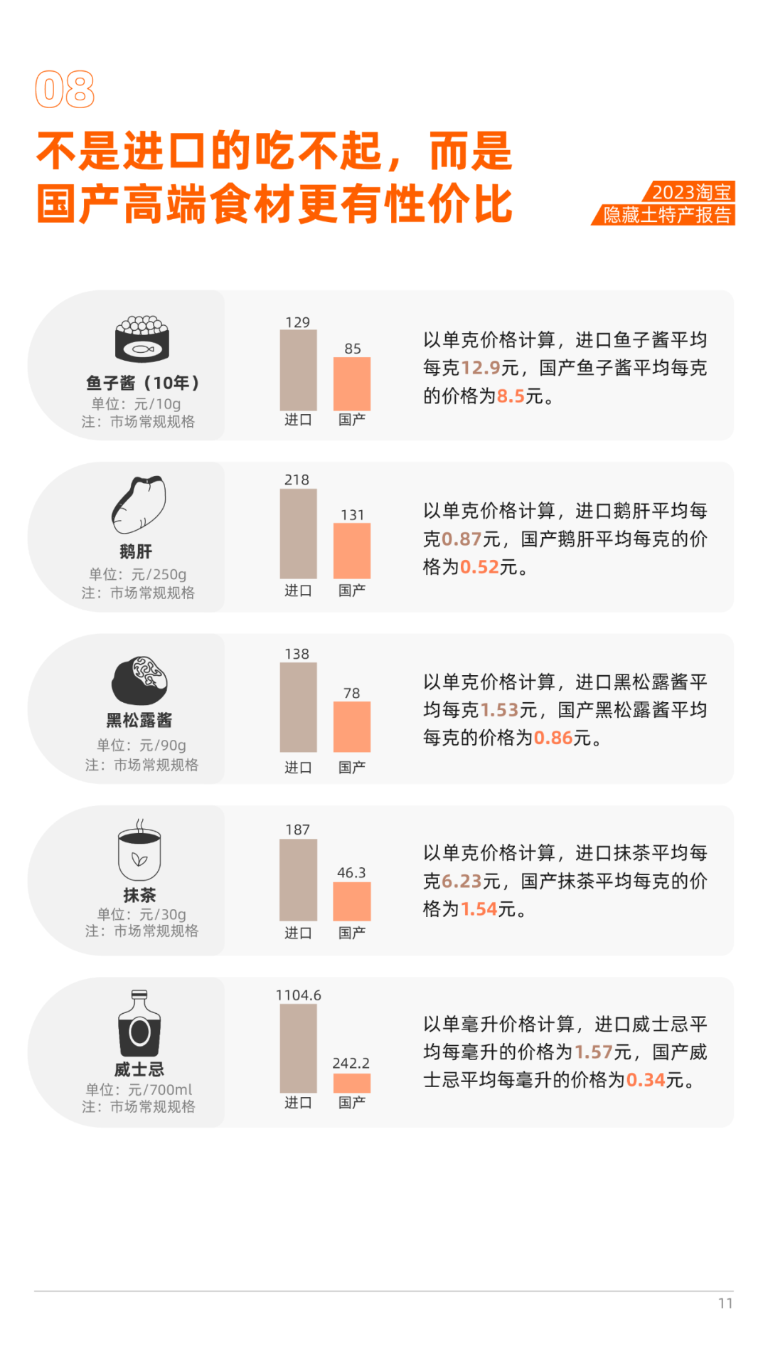 淘宝平台今年年初发布的《2023淘宝隐藏土特产报告》显示,若是以单克价格计算,国产鱼子酱平均每克的价格为8.5元,进口鱼子酱的平均每克单价则为12.9元。