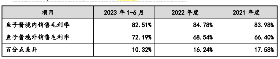 以鲟龙科技为例。其9成收入来自鱼子酱,综合毛利率逼近70%。2021年-2023年上半年,该公司的综合毛利率分别为65.88%、67.05%、69.65%,逐年增长。其中,鱼子酱产品的毛利率超过70%。2023年上半年,其鱼子酱产品在境内和境外的毛利率分别为82.51%、72.19%。