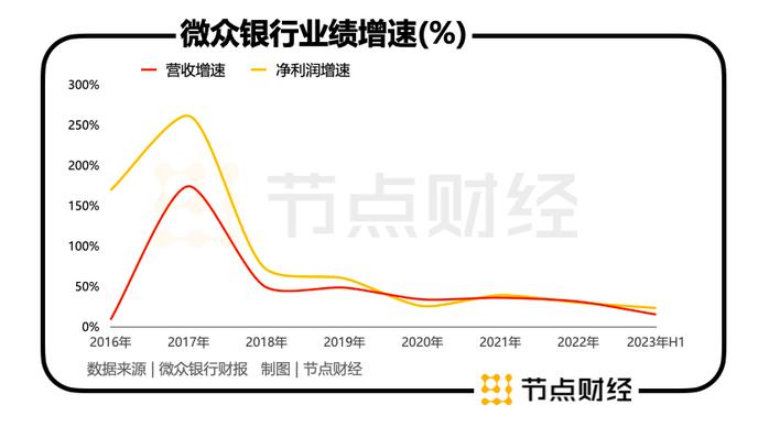 不过,进入2023年,微众银行的步伐开始慢下来。2023上半年,其营收同比增长15%;净利润同比增长23%,增速对比之前明显放缓。