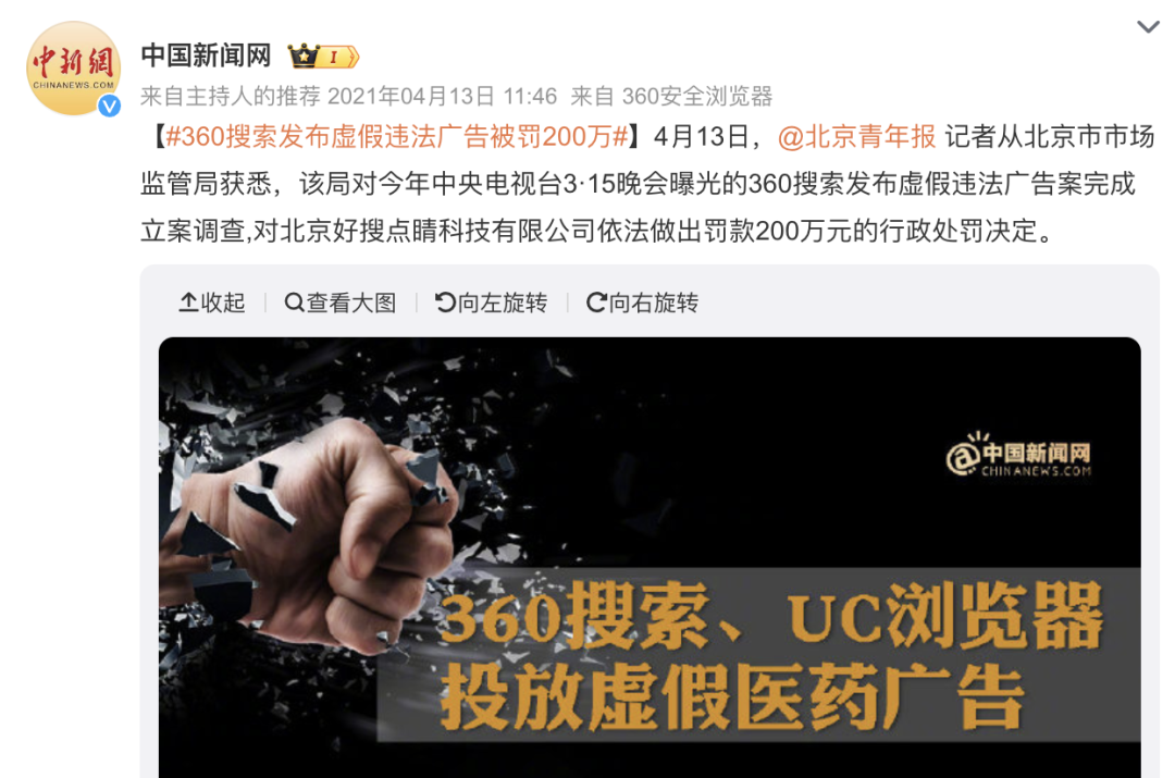 2021年的315晚会,360搜索和UC浏览器因为虚假广告被曝光。同样的问题在百度和搜狗上也出现过——“魏则西事件”至今仍然是每一个百度人不愿再提起的事情。