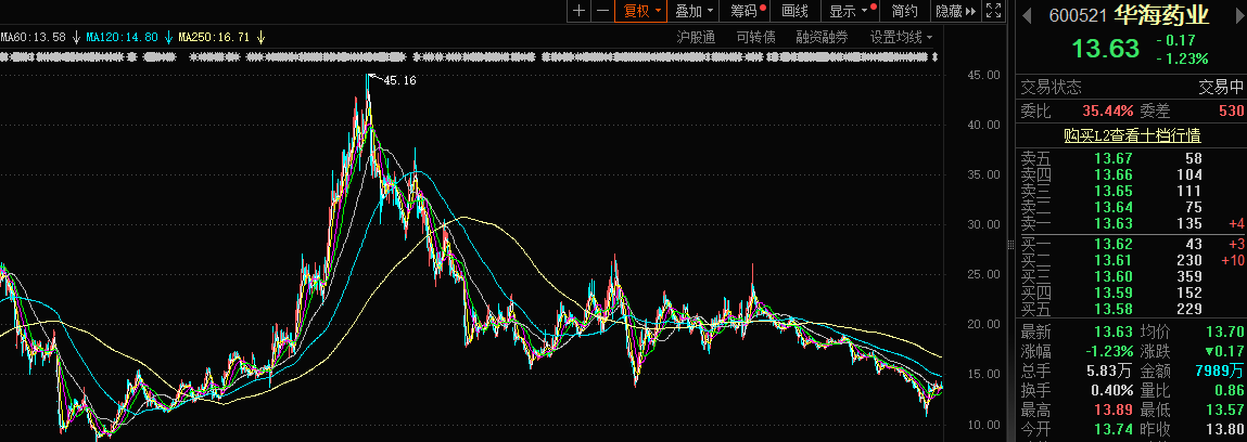 经营发展一波三折,华海药业的股票走势也令人不省心。在二级市场上,华海药业自2020年8月底触及历史高点45.16元/股后,公司的股价就进入到震荡下跌的趋势中,目前该趋势还在延续。