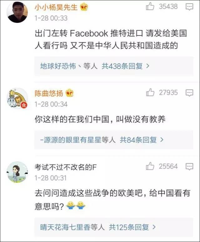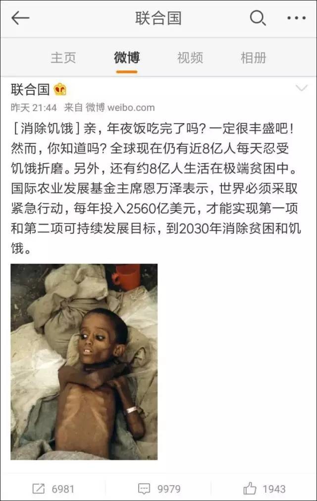 1月27日傍晚和28日凌晨,联合国新浪微博官方账号先后发表了两条微博,一条称,“年夜饭吃完了吗?一定很丰盛吧!然而,你知道吗?全球现在仍有8亿人每天忍受饥饿折磨”,另一条则写道“当新春礼花绽放的时刻,我们带你去看另一个世界”,并配发了一个展现全球战乱地区的视频。这引发了不少中国网友的不满和争议,“大过年的发这个,感觉怪怪的。”截至初一晚上8点,这两条微博的评论数已经分别达到2.4万和4.7万,远远超过平时500左右的评论数。